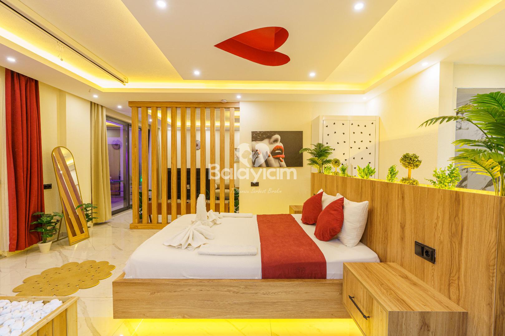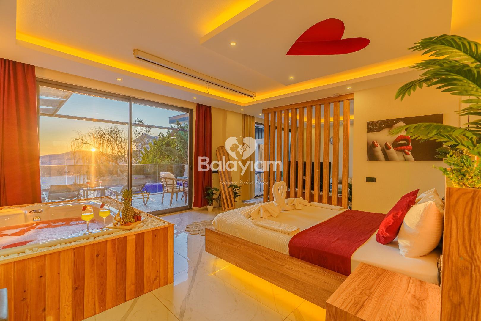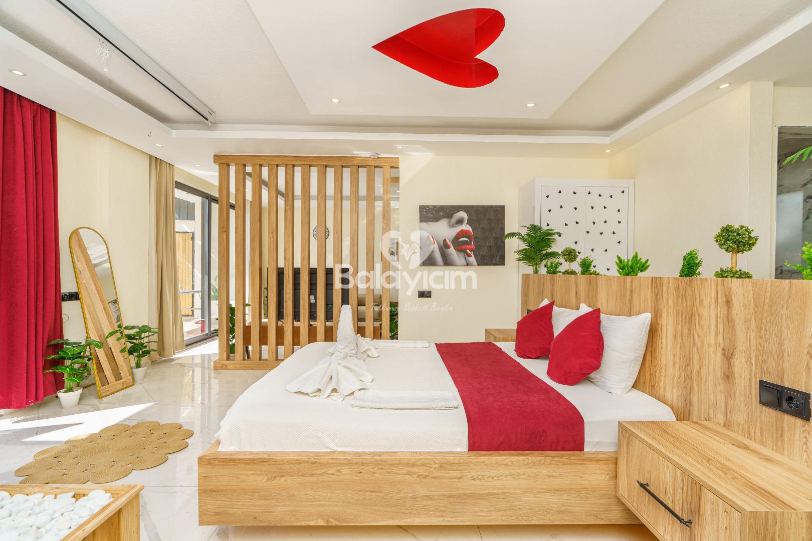 İki kişilik bu özel mekân tamamen sizin! Tek yatak odası ve özel banyosuyla, baş başa kalmanın tadını çıkaracaksınız. Villa İlkim'in iç dekorasyonu tek kelimeyle muhteşem - her detay özenle seçilmiş, her köşe aşkınızı yansıtacak şekilde düzenlenmiş.