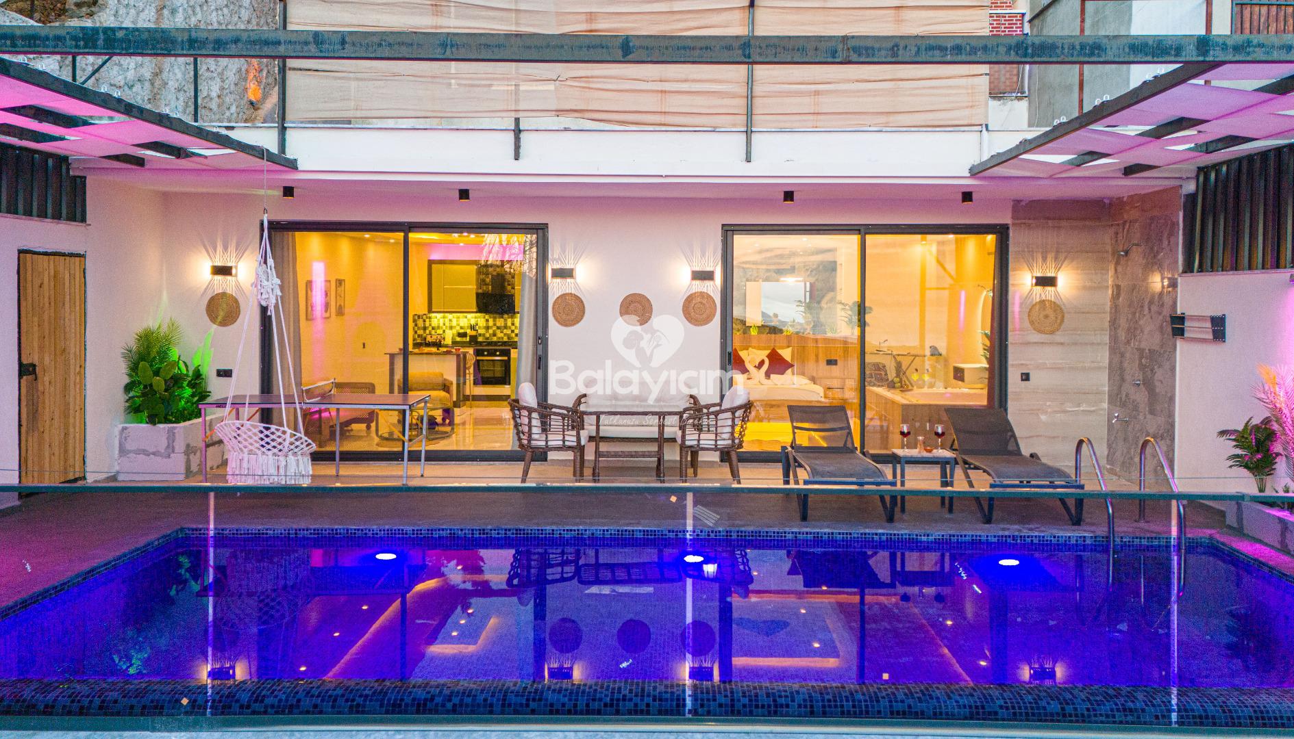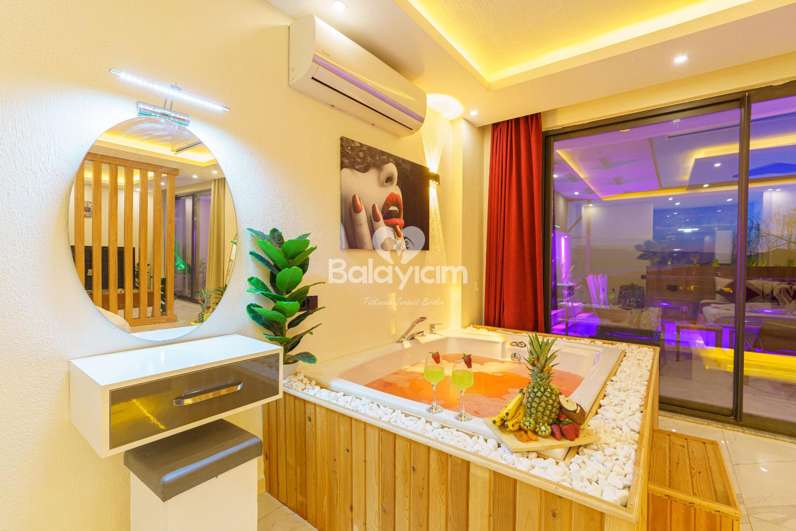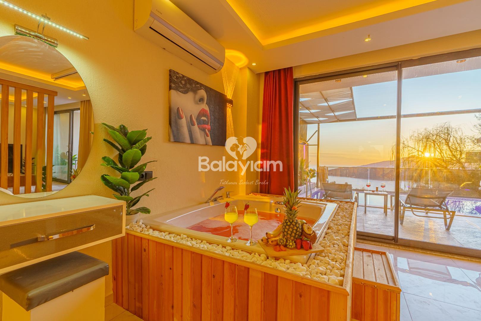 İşte Villa İlkim'in kalbi: Villanın içinde sizi bekleyen özel jakuzi! Sevdiğinizle birlikte gevşemenin ve birlikteliğinizi kutlamanın en romantik yolu. Jakuzinin sıcak sularında, dışarıdaki manzarayı seyrederken aşkınızı taçlandıracak unutulmaz anlar yaşayacaksınız.