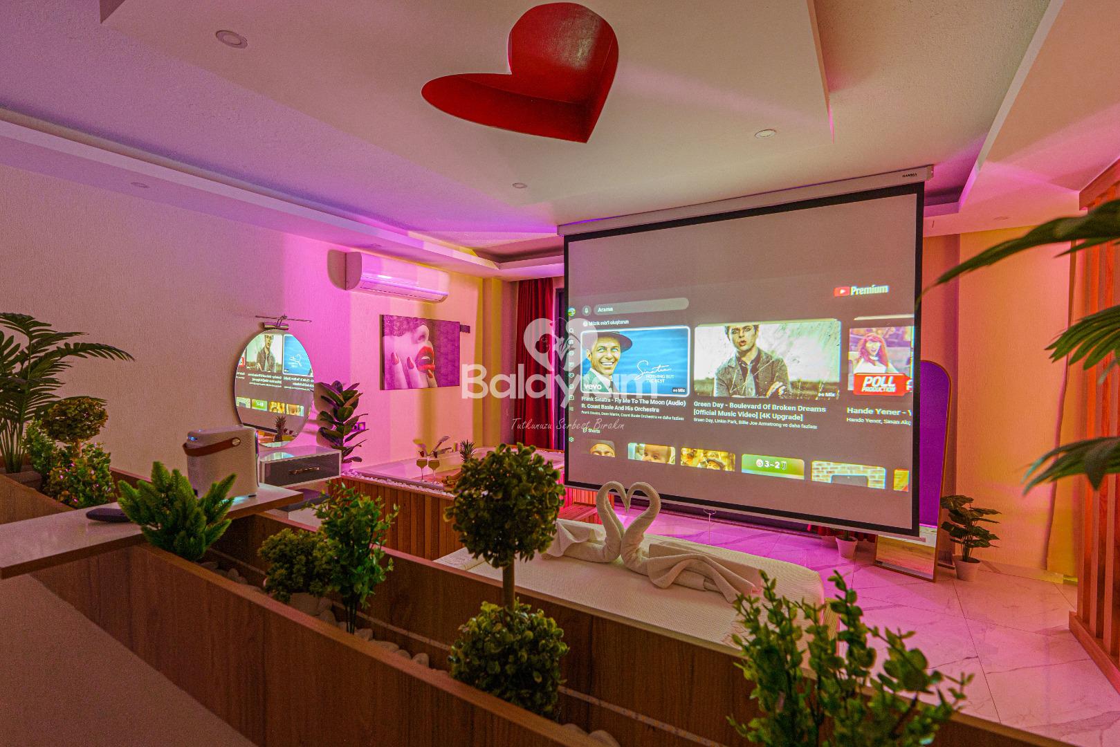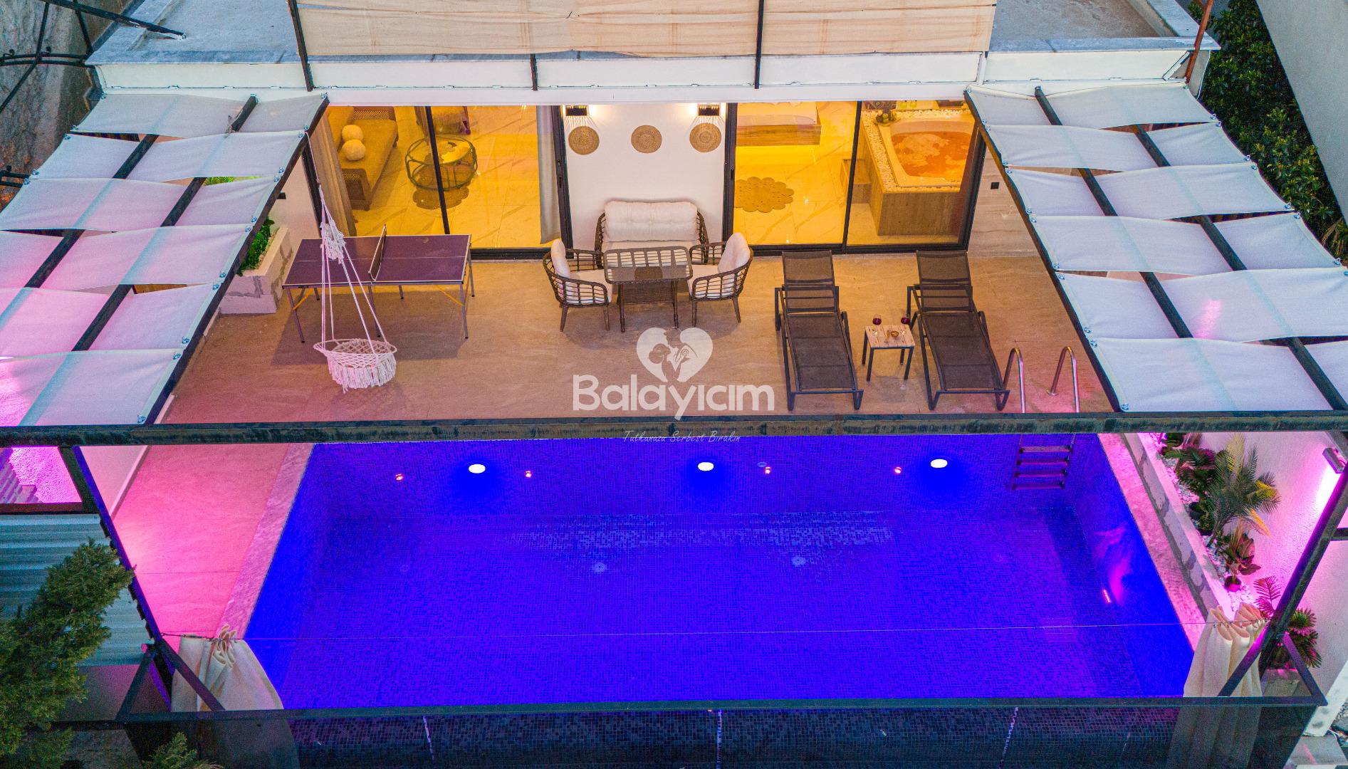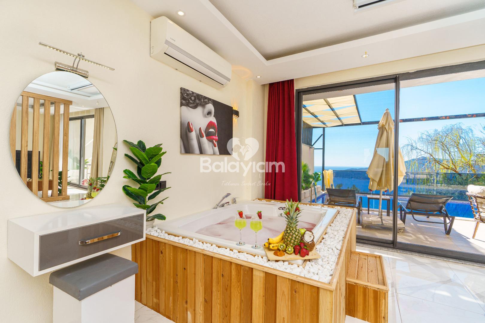 İşte Villa İlkim'in kalbi: Villanın içinde sizi bekleyen özel jakuzi! Sevdiğinizle birlikte gevşemenin ve birlikteliğinizi kutlamanın en romantik yolu. Jakuzinin sıcak sularında, dışarıdaki manzarayı seyrederken aşkınızı taçlandıracak unutulmaz anlar yaşayacaksınız.