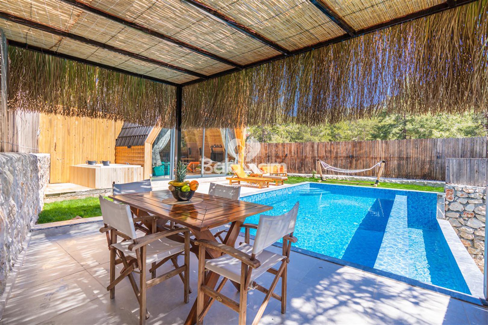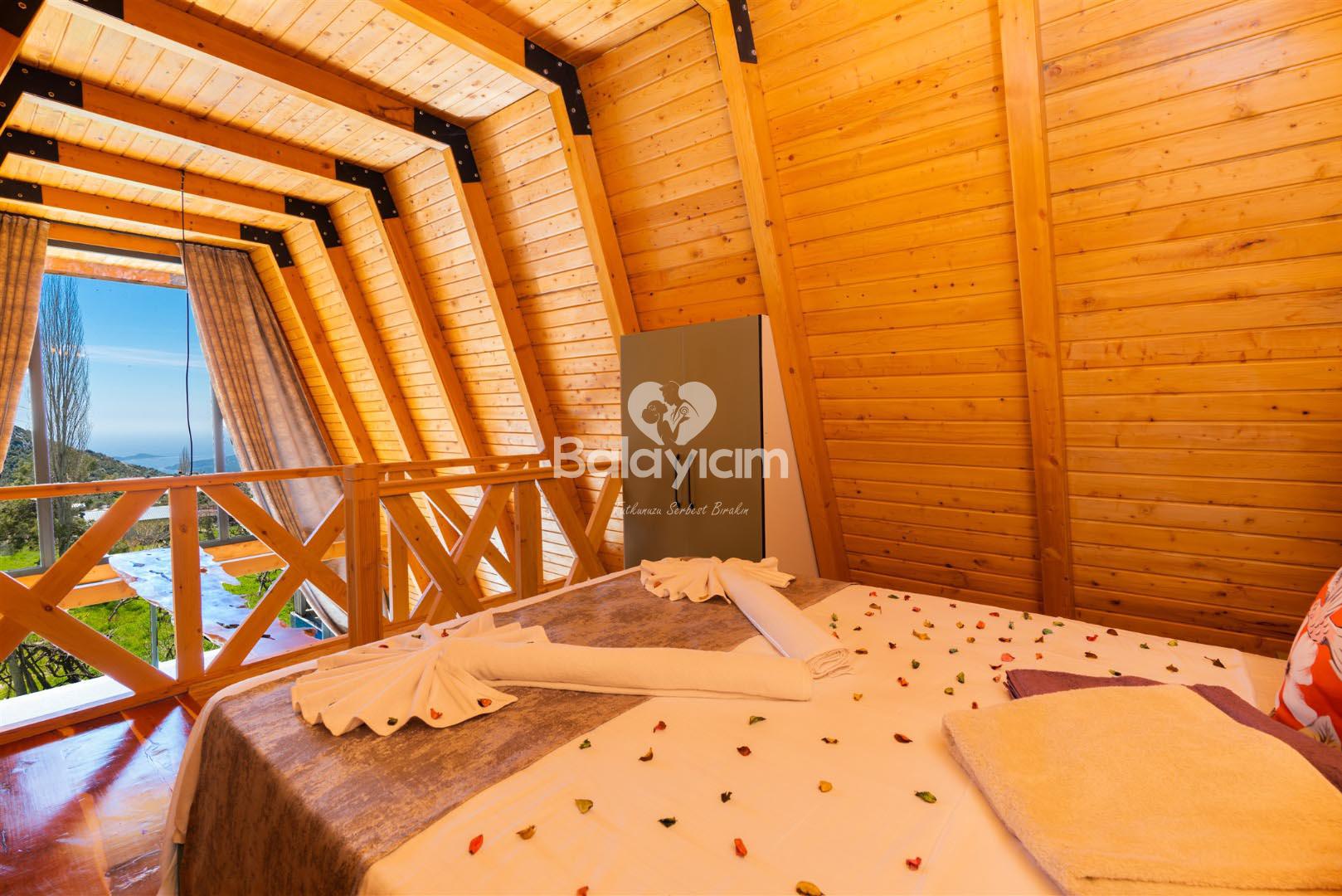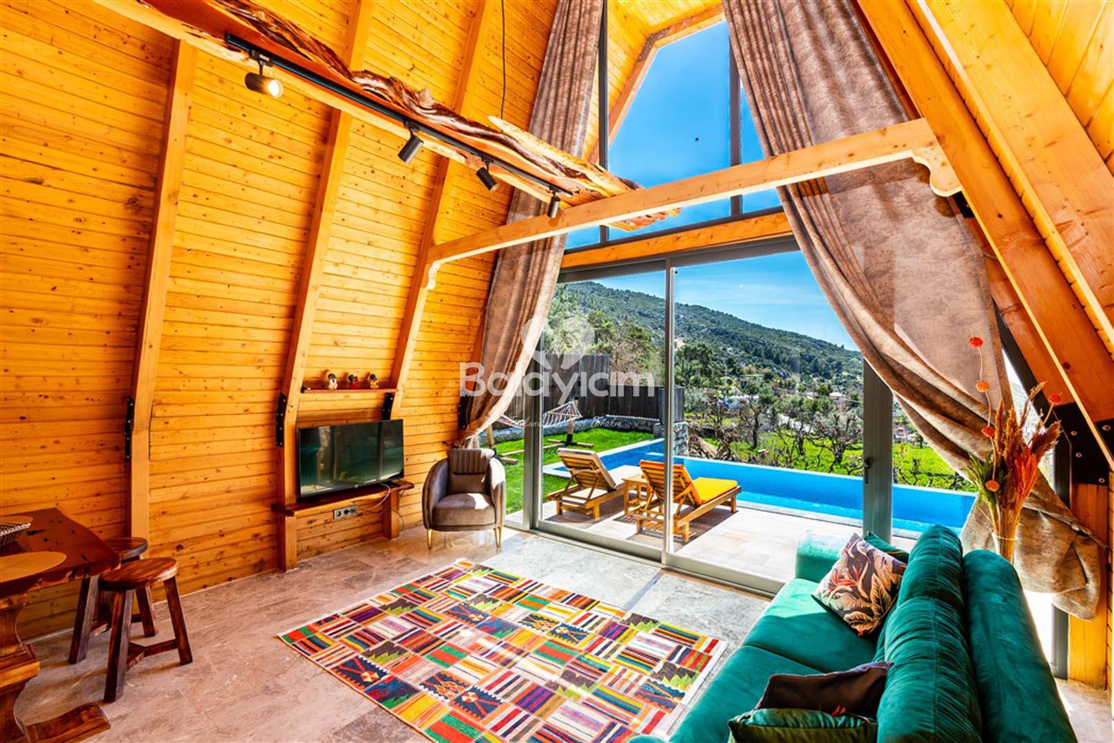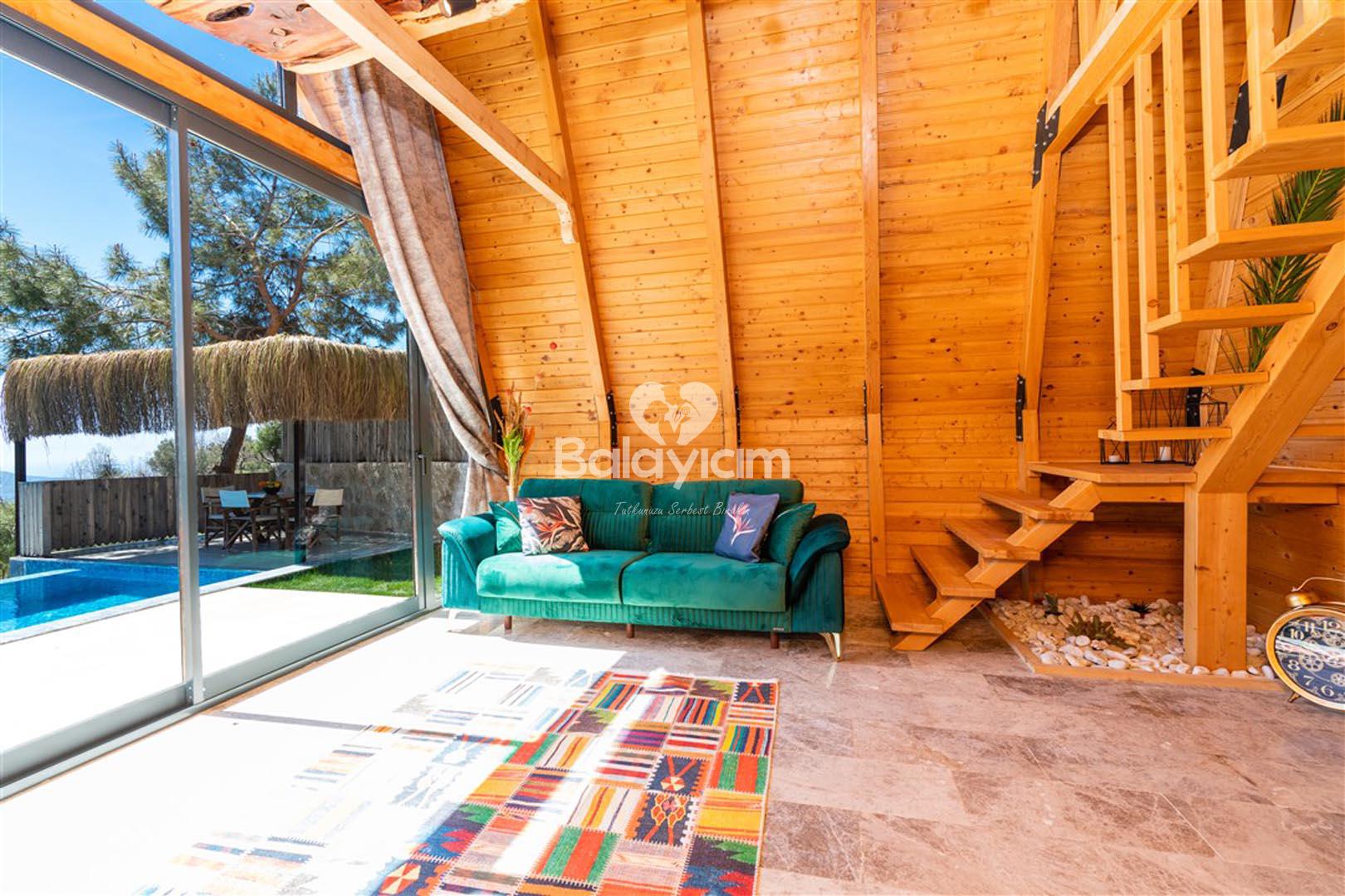 Kalkan İslamlar mevkiinde, balayı çiftleri için özel olarak tasarlanmış bir cennet sizi bekliyor! Villa Pedro, ahşap modern dış tasarımıyla dikkat çeken bu eşsiz bungalov, doğanın kucağında huzur dolu bir tatil deneyimi sunuyor.