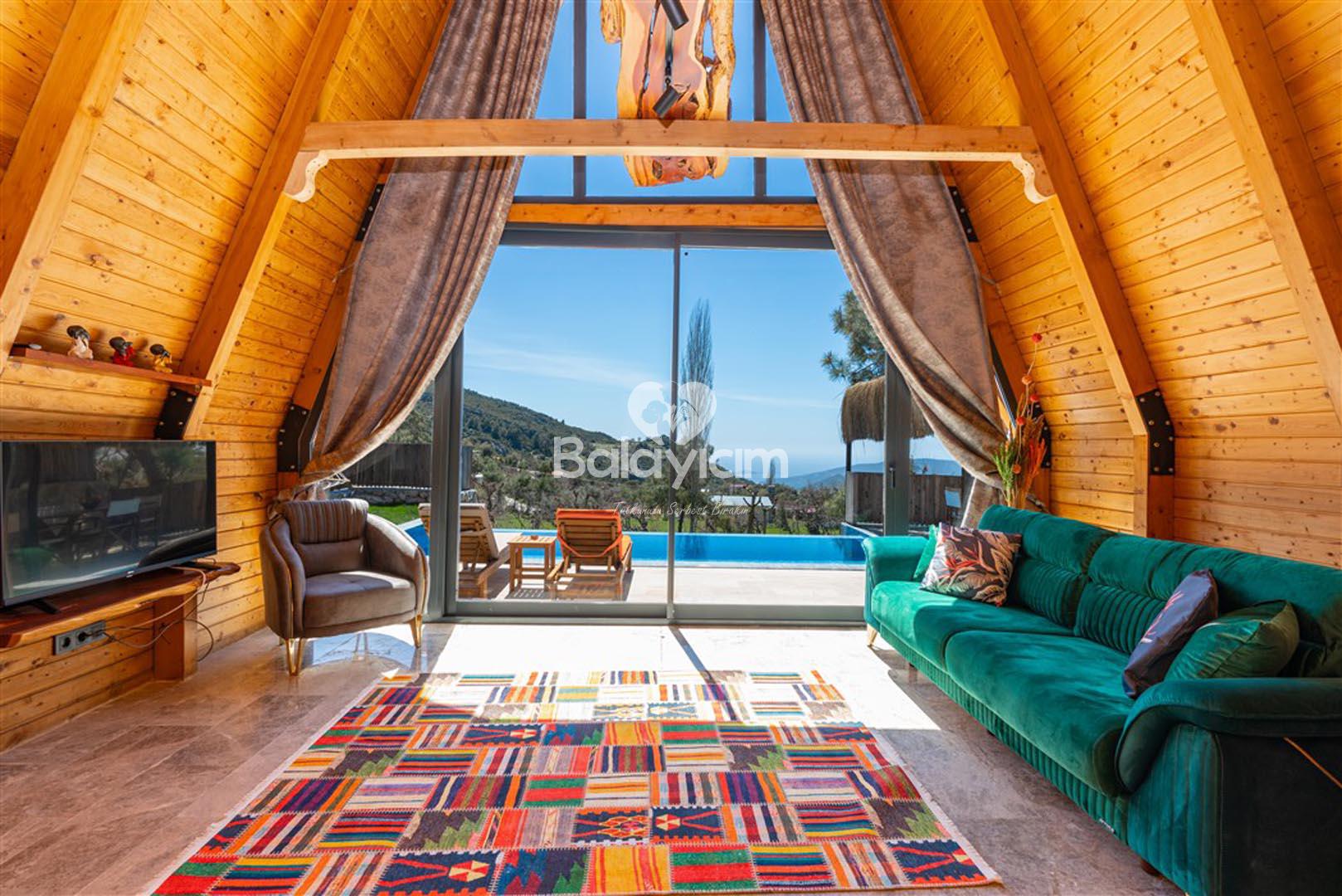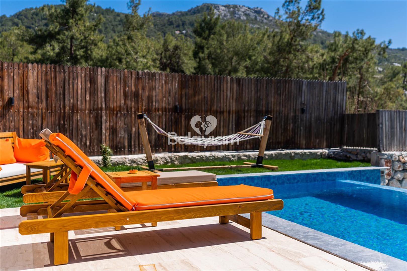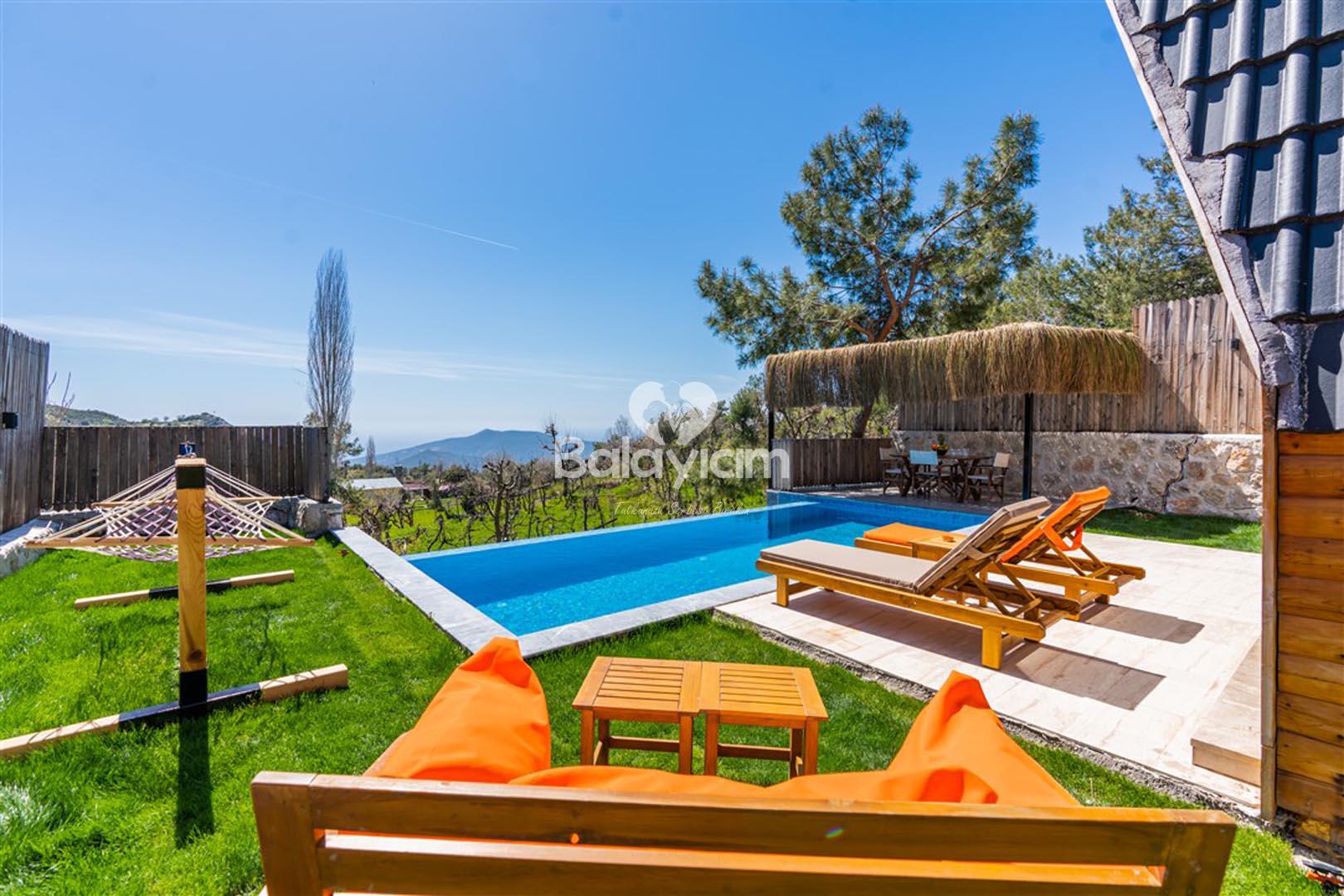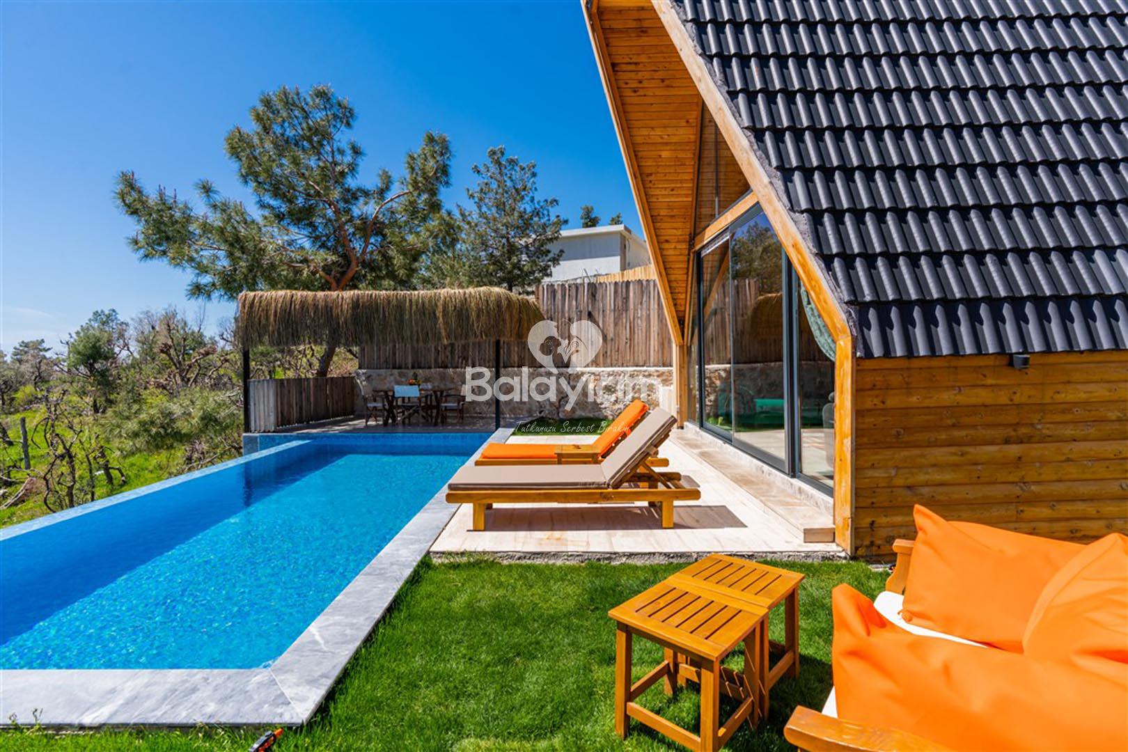 Kalkan İslamlar mevkiinde, balayı çiftleri için özel olarak tasarlanmış bir cennet sizi bekliyor! Villa Pedro, ahşap modern dış tasarımıyla dikkat çeken bu eşsiz bungalov, doğanın kucağında huzur dolu bir tatil deneyimi sunuyor.