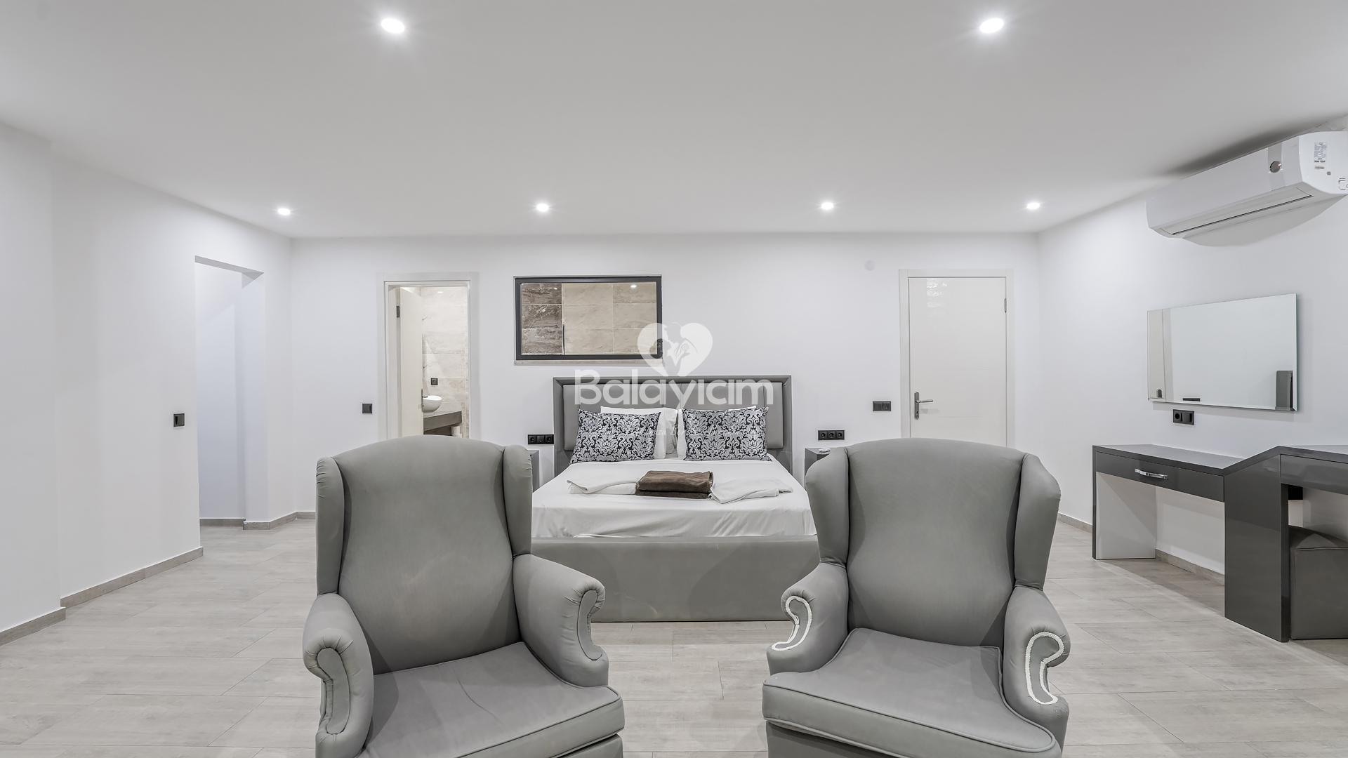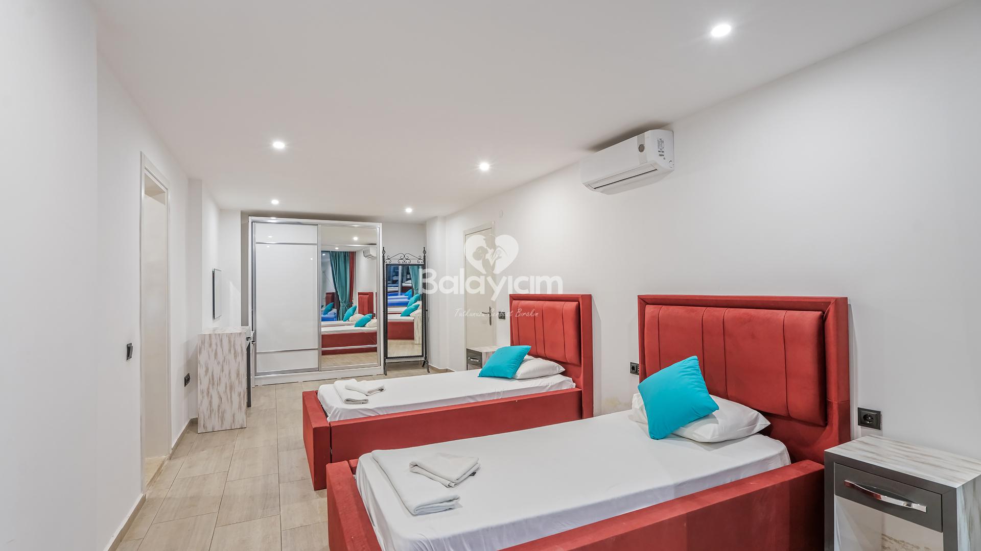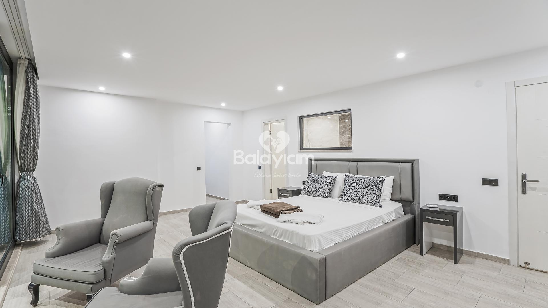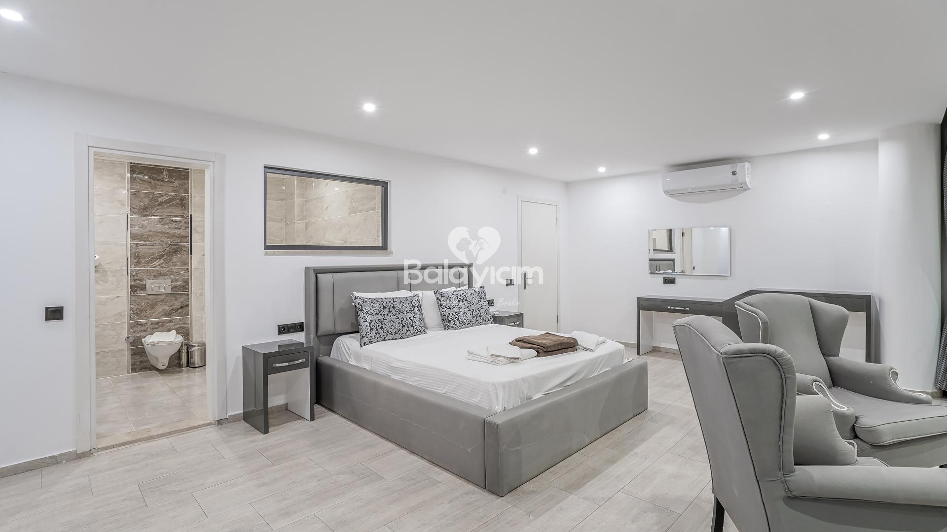 Villa Xsantos'un 4 geniş ve konforlu yatak odası, her misafirimizin kişisel mahremiyetini özenle koruyor. Ancak asıl sürpriz sizi teras katında bekliyor!